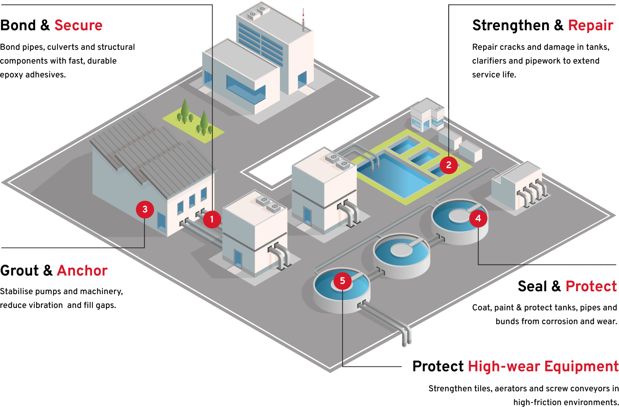 - Bonding materials and repairing cracks and defects in water infrastructure.