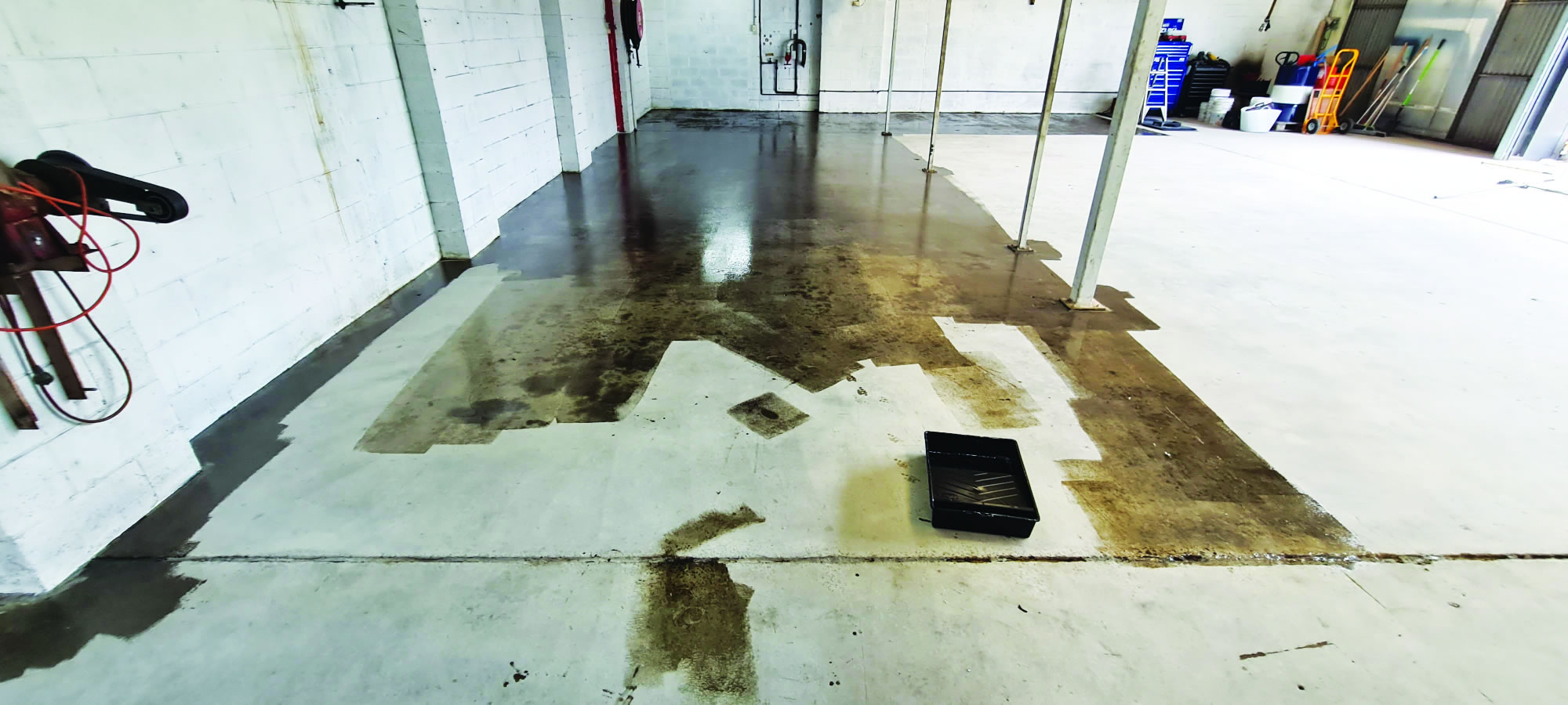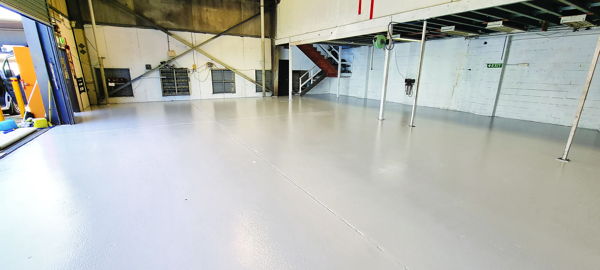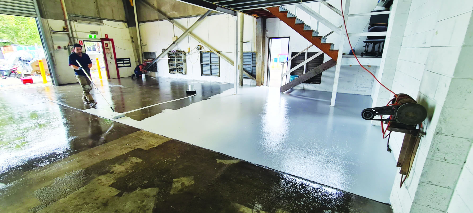 - The team removed the floor’s existing polyester resin and epoxy coating – grinding it back to a fresh concrete surface.