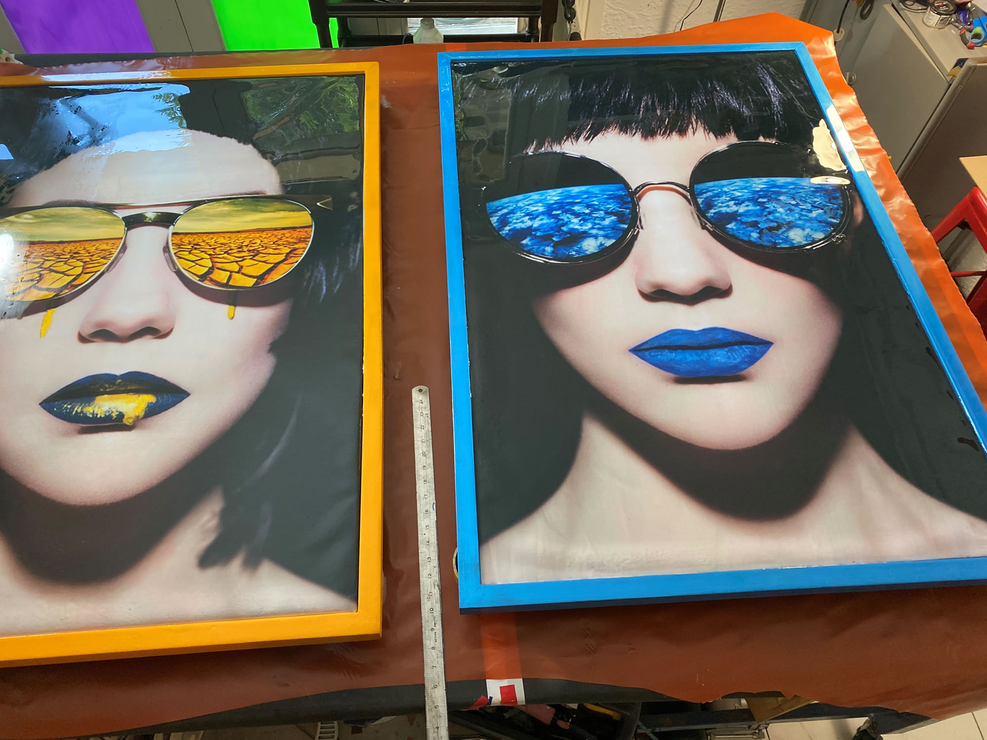 - He mixes and pours Megapoxy HX into the frame and lets it level out over the artwork.